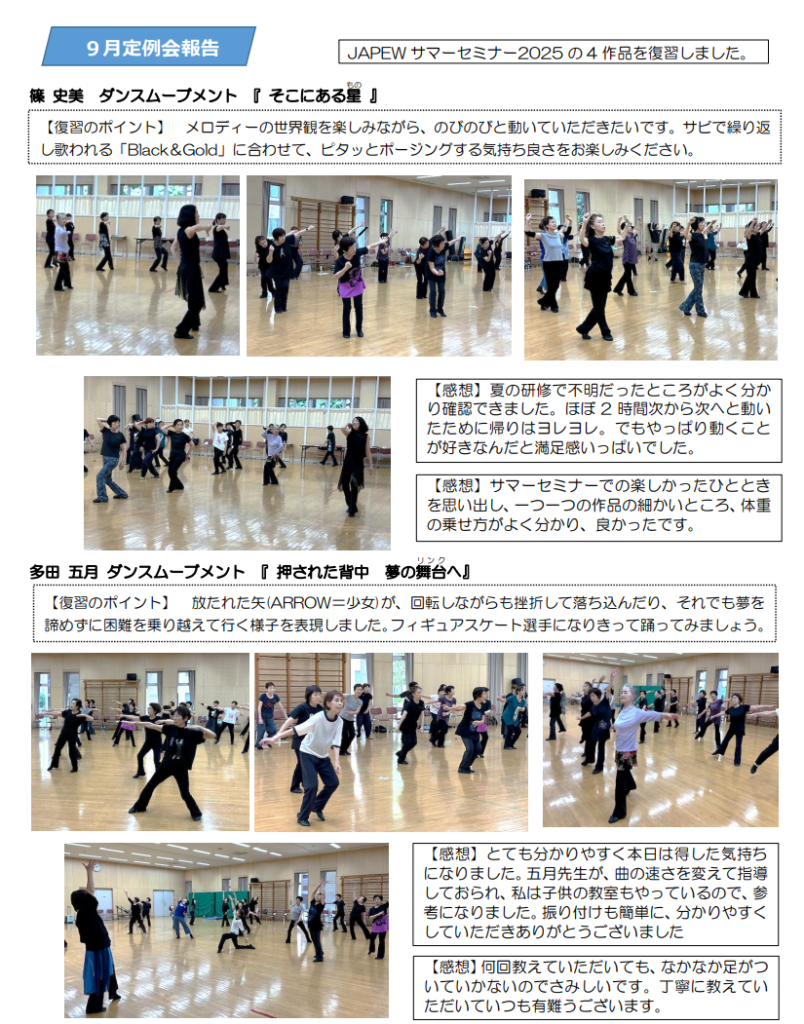 9月定例会は、37 名に参加いただき、「JAPEW サマーセミナー2025」で取り上げた 4 作品を復習しました。2 時間で 4 作品を躍り込むというかなり厳しい内容でしたが、みなさん最後まで笑顔で楽しんでくださいました。それぞれの作品からの学びを皆さんの教室で生かしていただければ幸いです。11 月以降、外部の講師も交えて、定例会が開催されます。学びのある定例会としていきましょう。