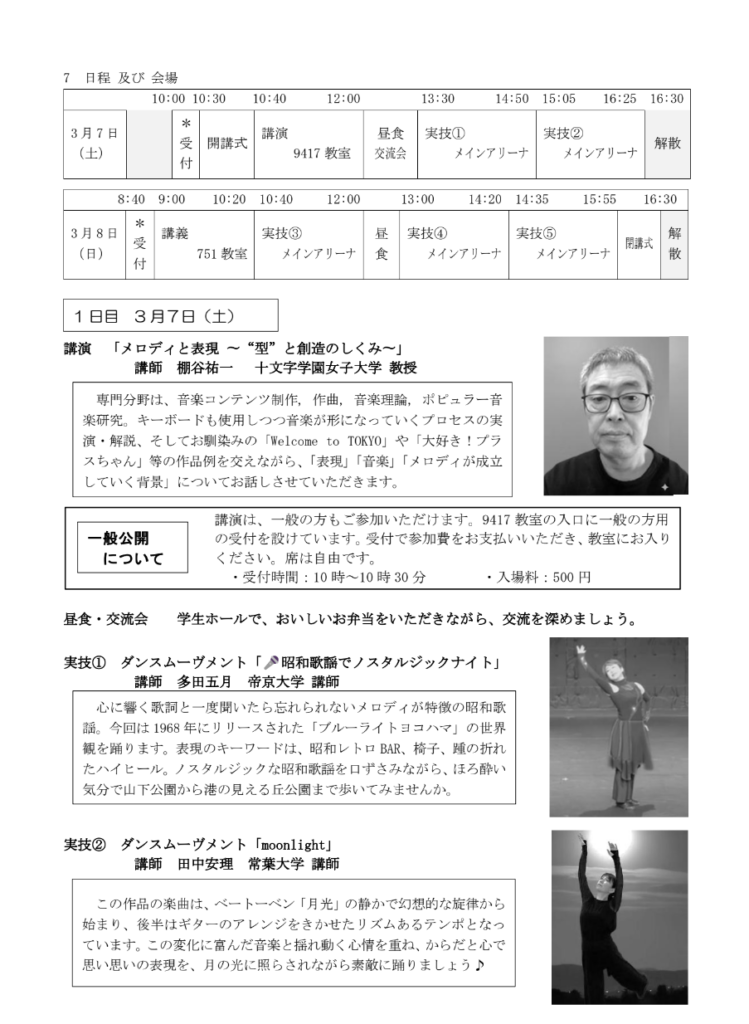 るジャズの世界~」として実技のご指導いただきます。エネルギッシュな先生方から、たくさんの刺激をいただけることでしょう。内部講師として、飯田路佳、田中安理、多田五月が実技「ダンスムーヴメント」を担当し、1年間の締めくくりとなるよう準備を進めています。今回は、昼食会を企画しています。7日の昼食は、学生ホールに集まっていただき、こちらで用意したお弁当を食べながら、約1時間、楽しく語り合い、交流を深めましょう。