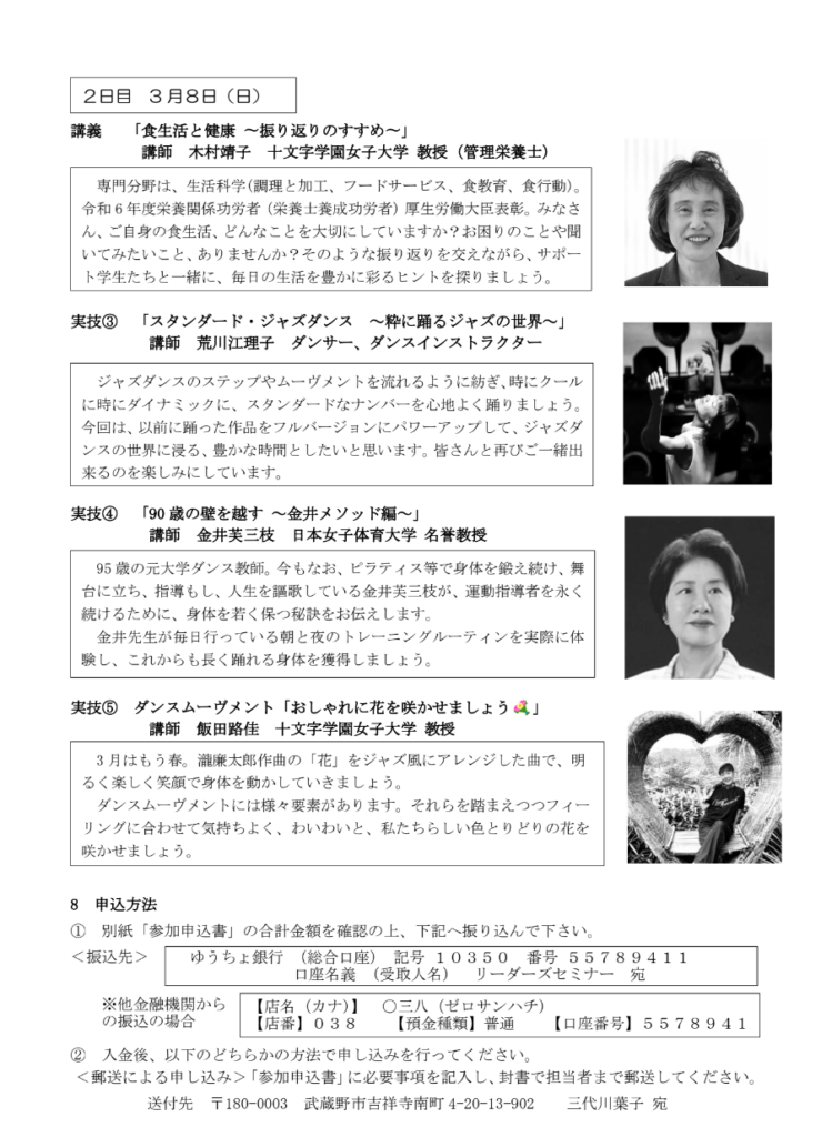講演は、「Welcome to TOKYO」「大好き!プラスちゃん」を作曲された棚谷祐一先生に「メロディと表現〜“型”と創造のしくみ〜」というテーマでお話しいただきます。講義は、十文字学園女子大学健康栄養学科の木村靖子先生に「食生活と健康〜振り返りのすすめ〜」というテーマでグループワークも取り入れ、ご指導いただきます。外部講師として、金井芙三枝先生には「90 歳の壁を越す~金井メソッド編~」、荒川江理子先生には「スタンダード・ジャズダンス~粋に踊